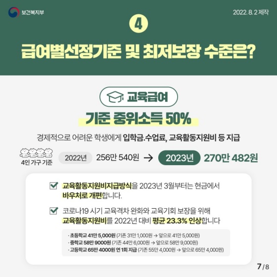 ◇ 2023년 3월부터는 교육활동지원비가 저소득층의 교육활동에 보다 많이 사용될 수 있도록 지급방식을 현금에서 바우처로 개편합니다.