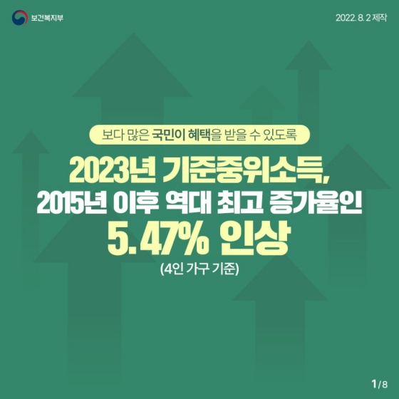 ◇ 2023년 기준 중위소득은 '저소득층에 촘촘하고 두텁게 지원한다'는 정책기조에 따라 2022년 기준 중위소득보다 5.47%(4인 가구 기준) 증가한 금액으로 결정됐습니다.