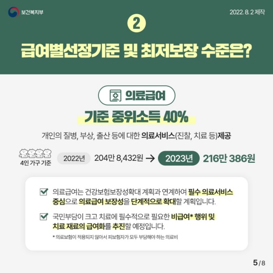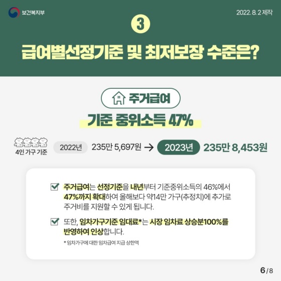 ◇ 중앙생활보장위원회에서는 2023년도 기준 중위소득과 함께 2023년도 각 급여별 선정 기준 및 최저보장 수준도 확정했습니다.