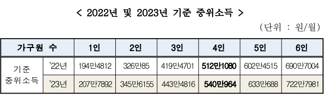 가구원 수에 따른 2023년도 기준 중위소득은 다음과 같습니다.